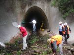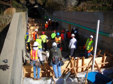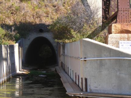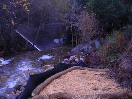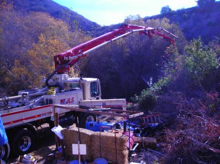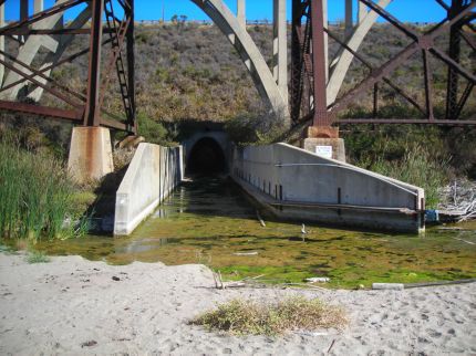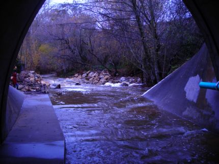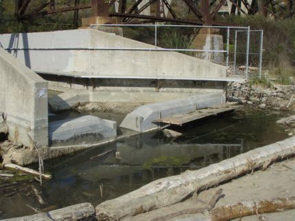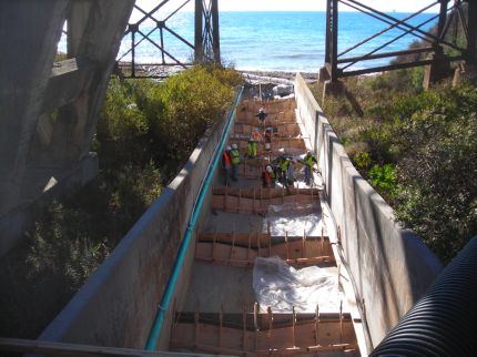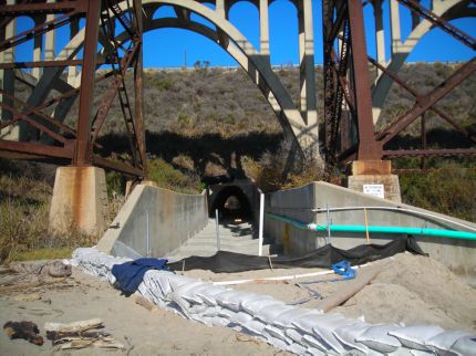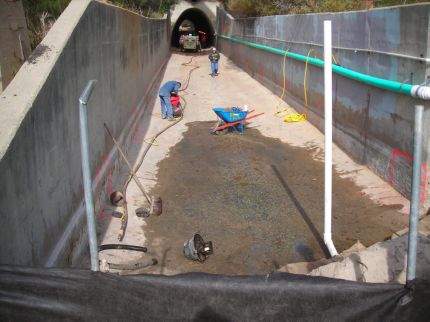 The project was a steelhead fish passage project consisting of installing cast in place concrete baffles in the large 16’ wide box culvert/tunnel under the state Highway 101 and Southern Pacific Railroad trestle. At the head of the tunnel a resting pool was created. Once finished, the velocity of the water flowing through the culvert was slowed enough at 16’ intervals to allow the fish to move through the tunnel to the spawning grounds under a much broader range of water flows than previously allowed by the pre-existing site conditions. The project required careful planning and coordination with numerous agencies and monitors due to the presence of endangered steelhead trout, red legged frogs, tidewater gobies and various other species of concern. |