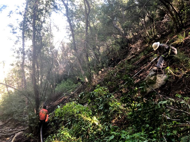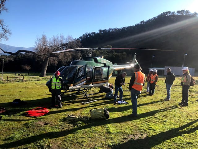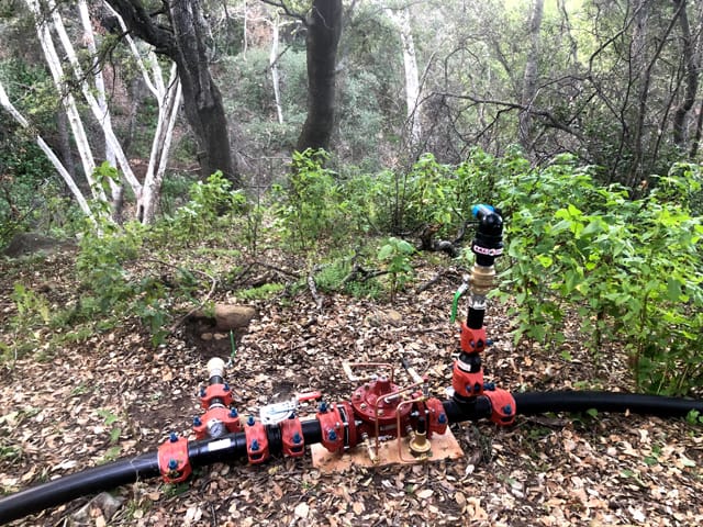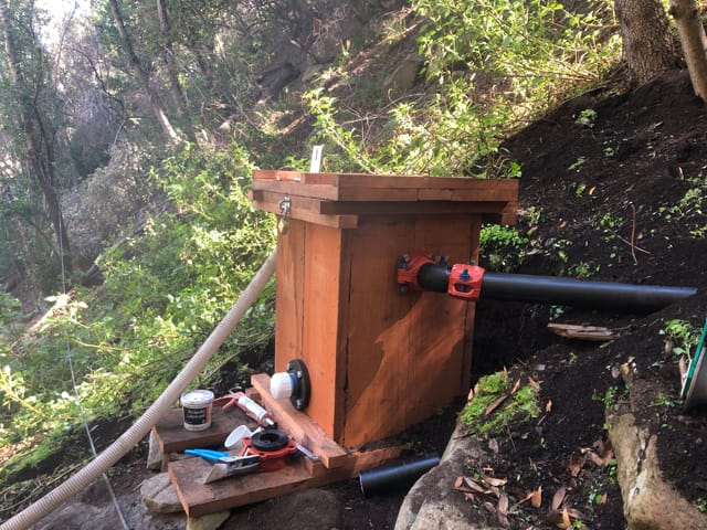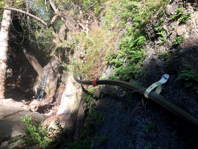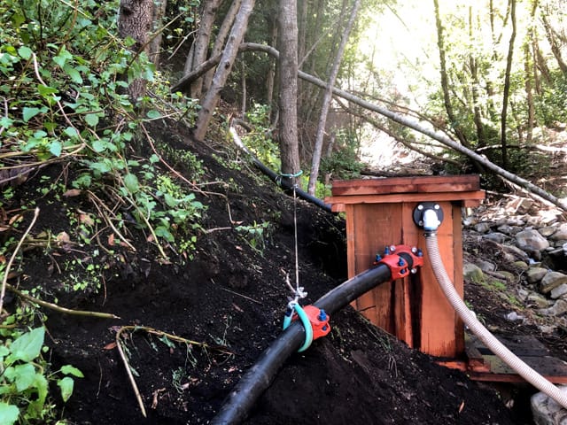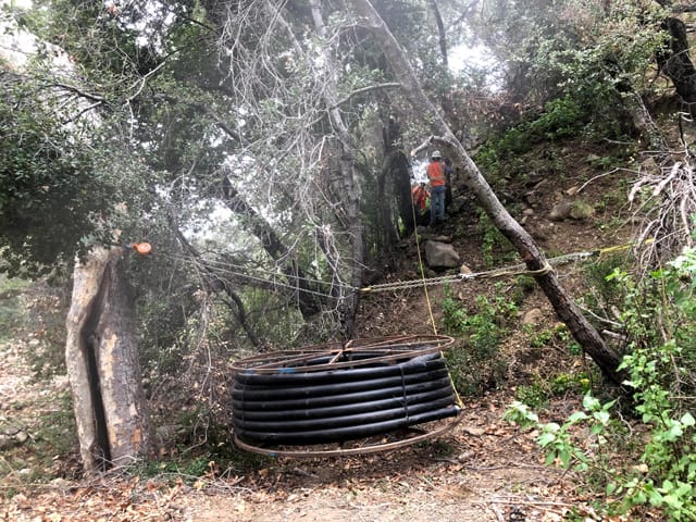 Rancho Alegre Camp Project: Spring Water LineRancho Alegre was supplied by water from a spring up the adjacent Tequepis Canyon since the 1930’s. The pipe was all steel and mostly on the surface. The Whittier Fire and post fire debris flow destroyed much of the system. The diversion intake is over 2 miles from the tank location on USFS property. The camp staff went through a lengthy process to obtain the permits to replace the system. We worked closely with the USFS, biological monitors & landowners to execute this project. The permits came available with only a short window to get the work done in February 2020. We had to scramble to devise a construction plan for approval. Our plan was to fly all the pipe and materials into the inaccessible portions that did not allow for any vehicle travel within the Forest using a helicopter. In addition, we had to remove the steel pipe and debris from the historic system. The forest service biologist determined just days before the flight day that there were nesting Southern Spotted Owls in the canyon on a certain slope. They would not allow the helicopter within .5 miles of the location and we had only a couple of days remaining before it was a complete no fly area. With all of the materials staged on the lower property we were able to fly all materials in 1 day to and from the site. The helicopter pilot was careful under the watchful eye of multiple biologists to avoid the owl no fly zone and skillfully drop the materials through the tree canopy at our designated drop points. Once all the materials were on site, we devised a method to pull the 3” diameter 1000 lbs rolls of HDPE pipe into position using a gas powered capstan winch, numerous large aluminum rolling blocks and 500’ lengths of high strength rope. We customized a large metal spool to hold the rolls which were then hoisted with chain hoist between trees so the pipe could be unspooled. The path was often through heavy brush, across steep slopes and rock faces. The pipe was anchored using bolts and metal straps, heavy nylon webbing & cables. A new spring box and intake were installed at the diversion point. Multiple pressure regulators were installed as there was over 1200’ of elevation from the intake to the lowest point of the system. Then the pipe climbs back up a steep slope to the 150,000 Gallon Tank. |